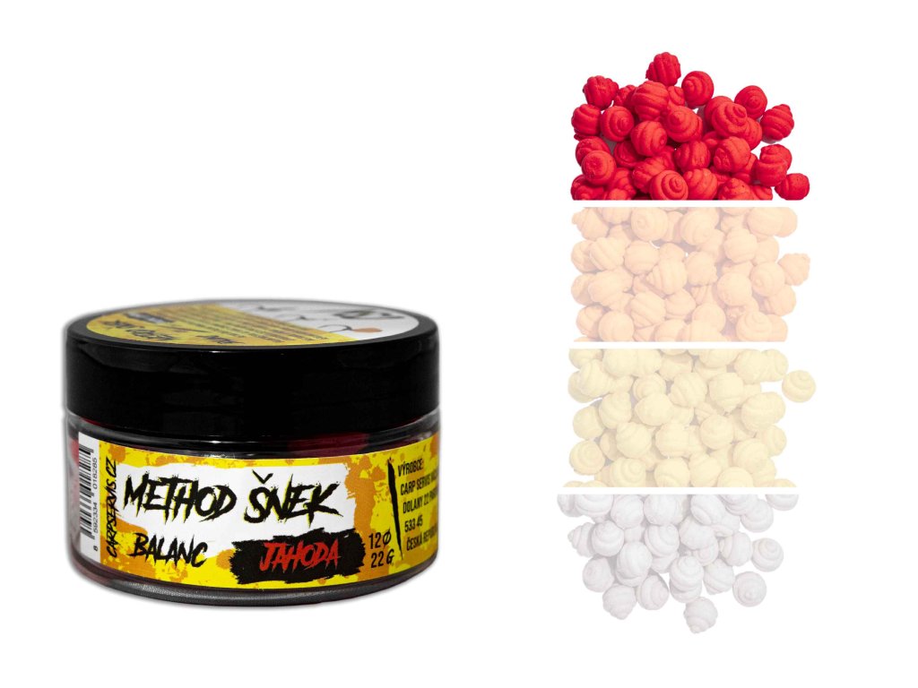 Method šnek balanc - přináší nejen klasické přednosti balanc nástrah, ale má i schopnost velmi intenzivního uvolňvování atraktorů a částečnou rozpustnost. Dalším atributem je inovativní tvar, který imituje přirozenou potravu různé druhy plžů, což je činí neodolatelnými pro většinu, i těch nejopatrnějších kaprovitých ryb. Nástrahu je možné dipovat pomocí Aroma Pop up nebo Aroma speciál od CSV. Aromatizační prostředky jsou nositelemidentických pachových silic, které jsou použity přímo v Method šnek balančních nástrahách. Vyrábí se v šesti variantách. - Příchuť: JAHODA - Průměr: 12 mm - Balení : 22 g - Barva: červená Výrobce: CSVDoplňkové parametry