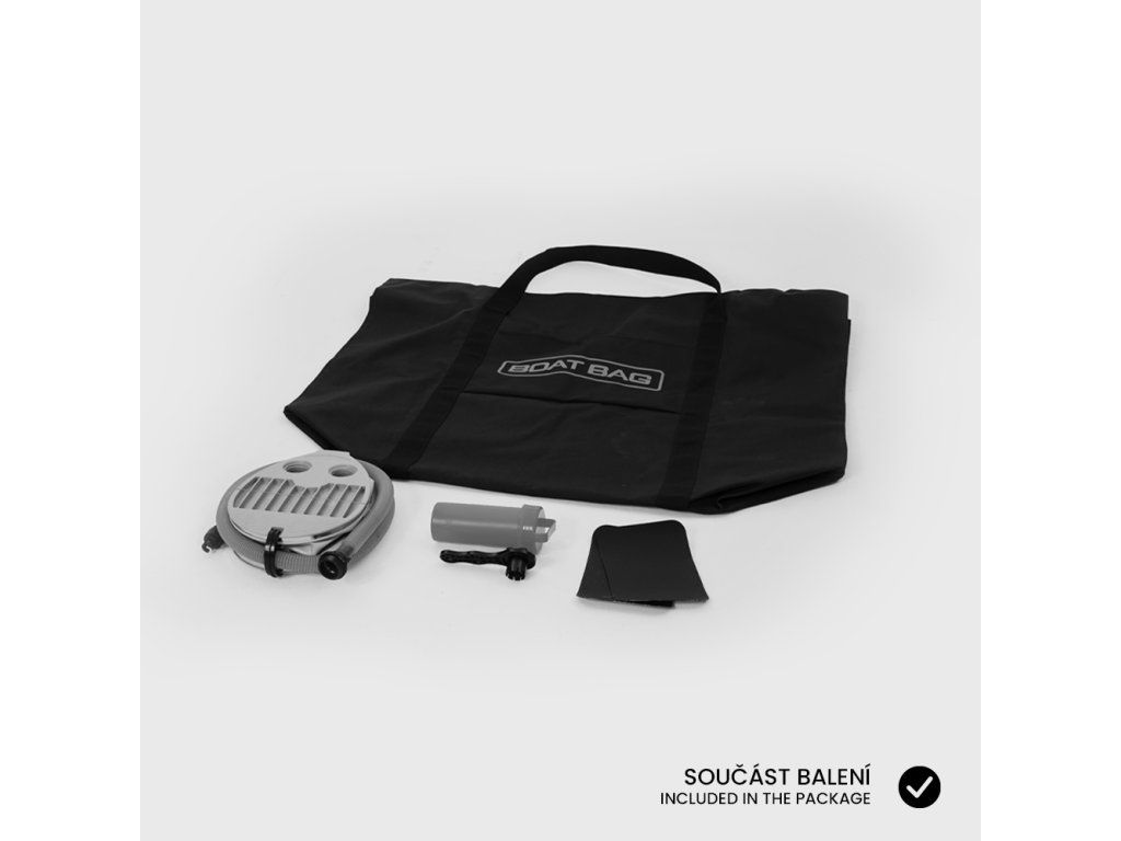 Součástí bellyboatu je přepravní taška, nafukovací pumpa, lepící sada