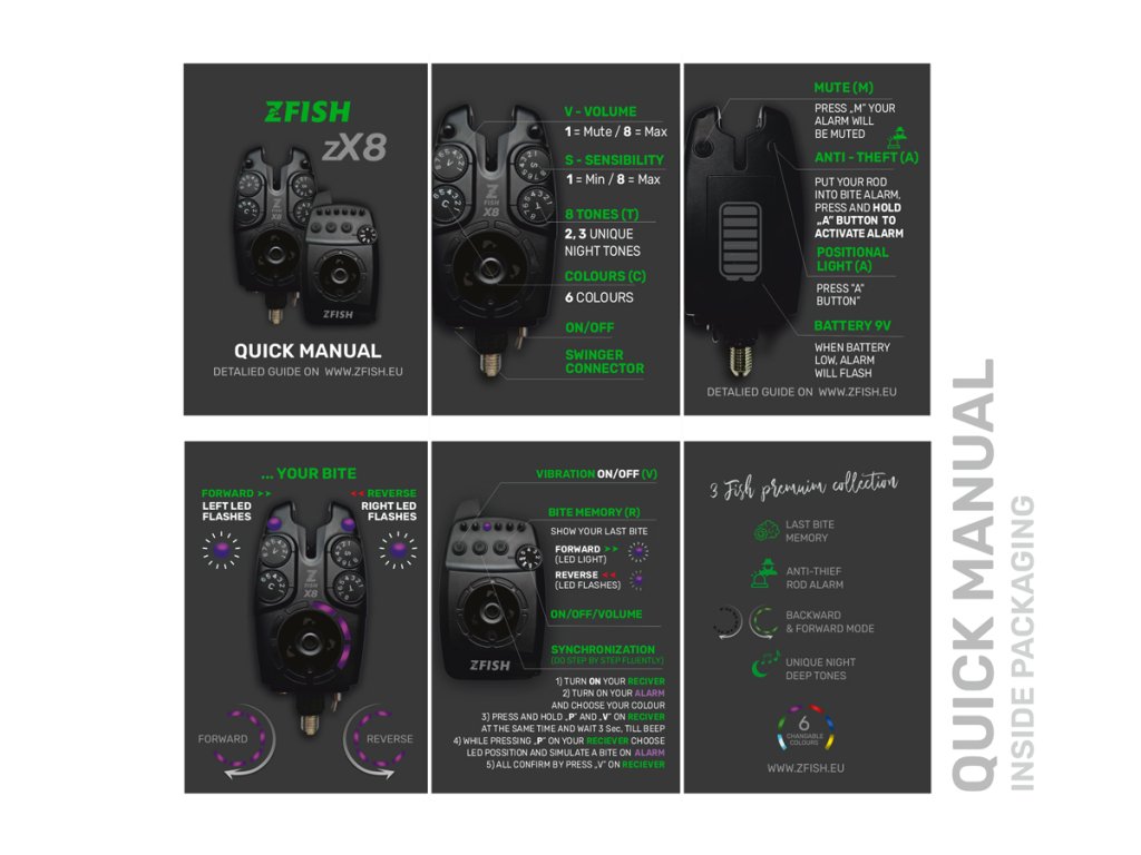 Nová generace hlásičů ZFISH Bite Alarm Zx8 PRO je nepochybně naše nová vlajková loď mezi hlásiči. Verze PRO představuje náš poslední nejvyspělejší model, při jehož vývoji jsme kladli důraz na odstranění všech nedostatků, které měla předchozí generace. Zx8 disponují 6-ti barvami a dokonce 8-mi zvukovými tóny (z nichž 2 jsou zcela unikátní hluboké tóny speciálně navržené pro noční rybolov) a navíc jsou opatřeny alarmem proti krádeži. Další užitečnou funkcí je paměťová dioda záběru, která vám umožní zjistit, zda jste měli “jízdu” (záběr vpřed), nebo takzvaný “padák” (zpětný záběr směrem k vám). Samozřejmostí jsou vibrace příposlechu a snadné nastavení celkové citlivosti a hlasitosti. Nové Zx8 byly testovány v extrémních podmínkách, takže za jejich odolnost proti vodě a prachu, můžeme dát ruku do ohně a navíc bez problémů fungují až na vzdálenost 200 m.