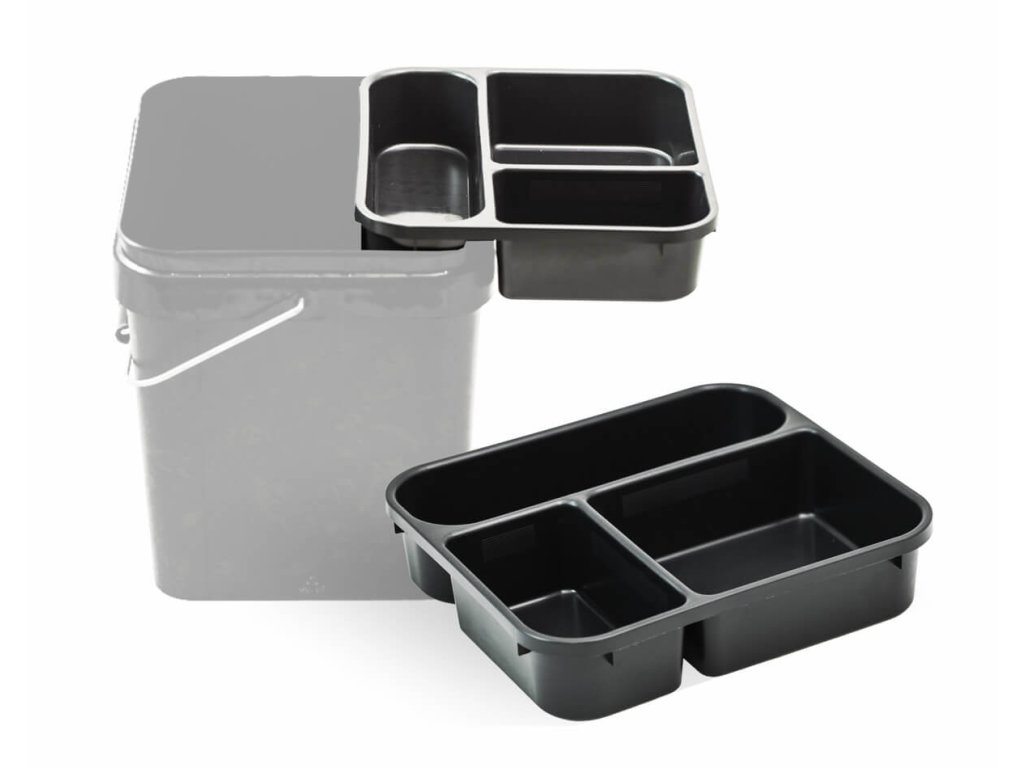 Praktická tříkomorová vložka určená pro přehledné uložení příslušenství, návnad a krmení.